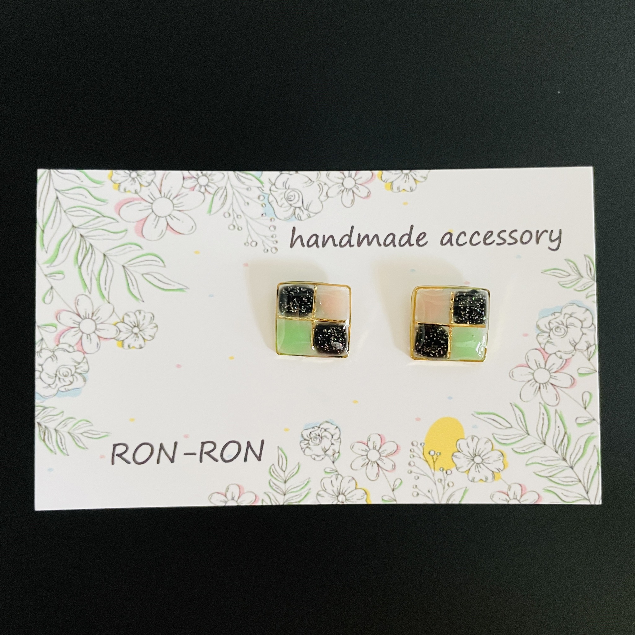 スクエア型のピアスに、シックなグリッターブラックとミルキカラーが4つに色分けされたレジンピアス。